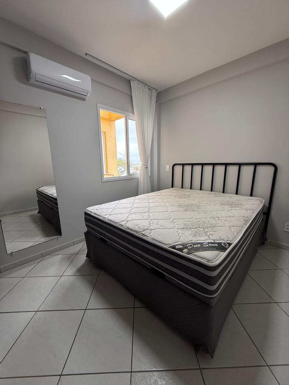 Disposição dos quartos: suíte com ar-condicionado e cama de casal + colchão de casal, quarto com cama de casal e ar-condicionado.