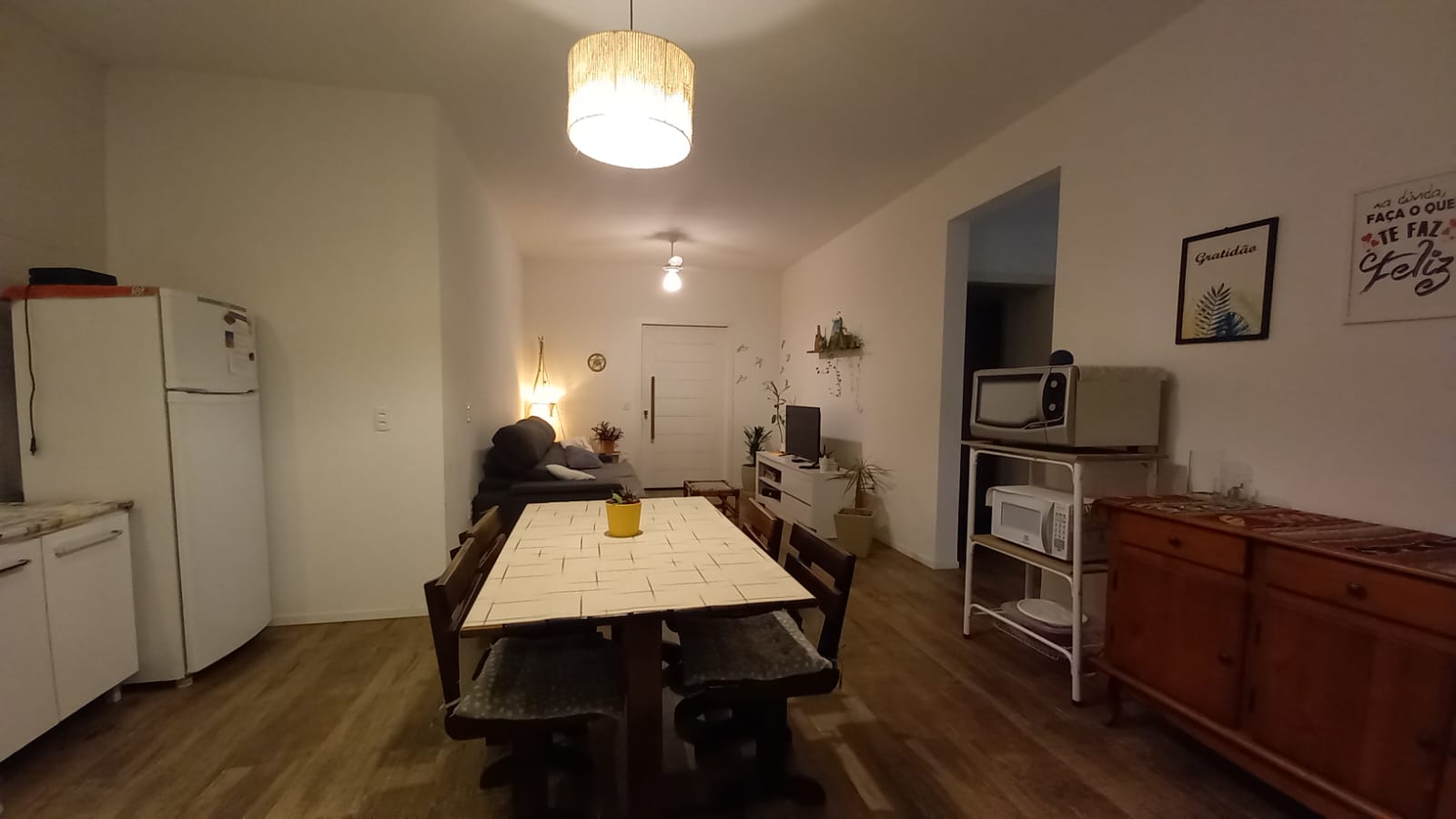 Na cozinha sanduicheira, air fryer, geladeira biplex, microondas, forno elétríco.
