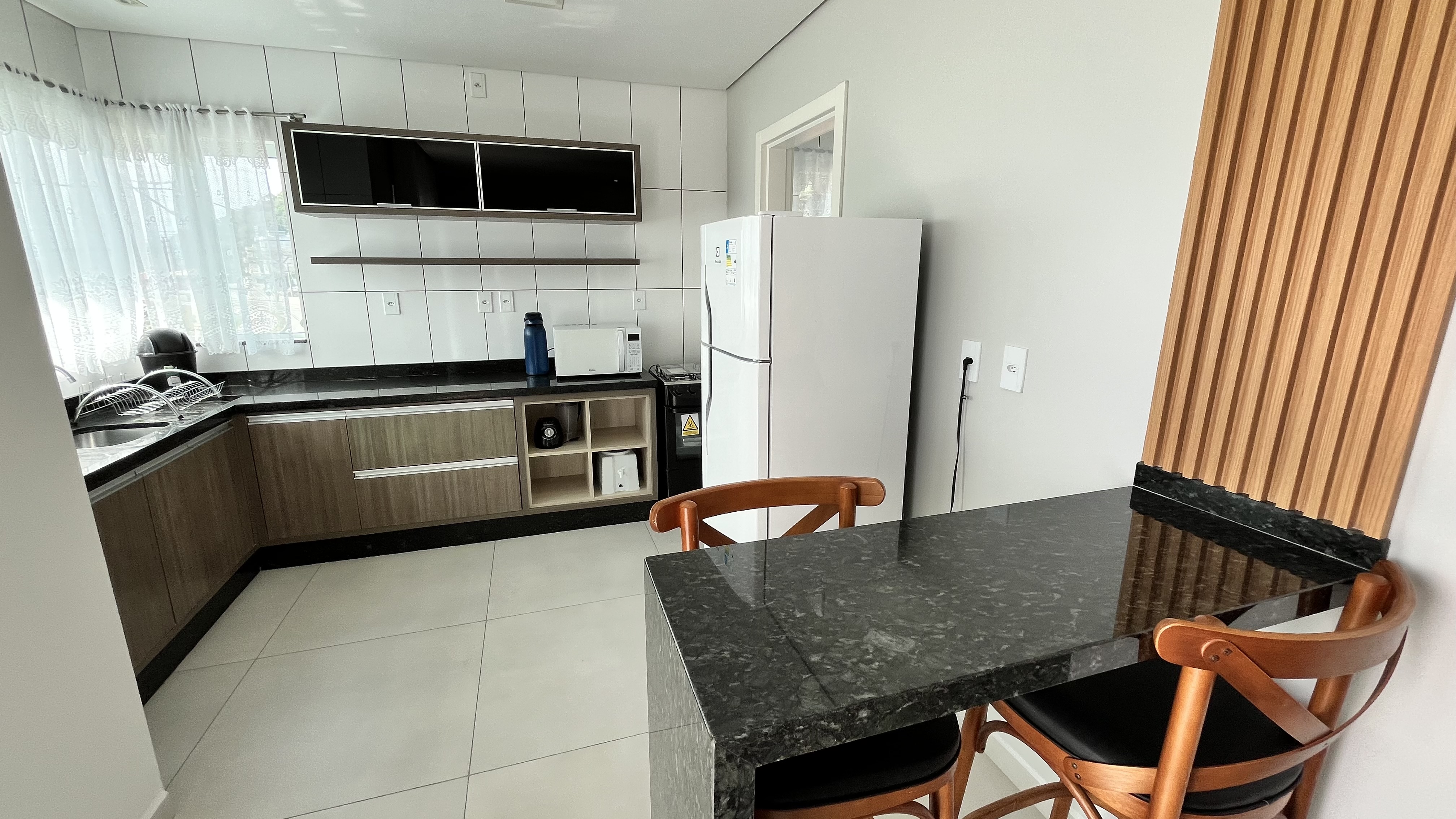 Cozinha com todos os utensílios básicos de louça para uso diário, geladeira, fogão e forno;