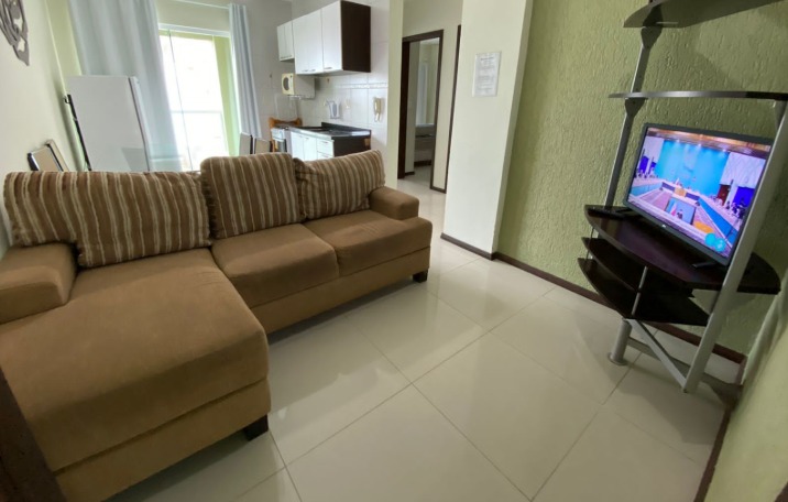 Ref. 358.202: LATERAL (SEM VISTA) - 1 quarto com ar condicionado, cama de casal + 1 colchão de solteiro extra; cozinha completa com fogão, forno, geladeira e microondas; sala com TV; lavanderia com máquina de lavar roupas e banheiro. Sacada com churrasqueira. 1 vaga de garagem. Ideal para casal e 1 crianças.